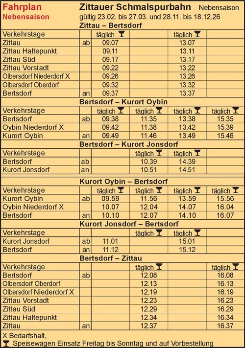 Ponořte se díky naším vlakům do světa uplynulých železničních ér a užjite si kulturu cestování předchozích generací. Kromě běžné denní služby parních vlaků jsou u Žitavské úzkokolejky v provozu střídavě o víkendech od května do října další tři muzejní vlaky. Každý zvlášť ztělesňuje jednu éru v historii saských úzkorozchodných železnic. Sachsenzug (Saský vlak) odveze cestující do doby Královské saské státní železnice. Tato doba se považuje za vznik a rozkvět úzkorozchodných železnic v Sasku. S vlakem „Reichsbahn“ se vydáte na cesty jako kdysi generace Vašich prarodičů nebo praprarodičů ve 20. a 30. let 20. století, zatímco v Žitavském motorovém voze můžete zažít poválečné období Železniční společnosti Reichsbahn. Stejně tak by se mohly stát zažitkem Vašeho výletu jízda s denně vypravovanými parními vlaky s paralelním odjezdem parních vlaků z nádraží Bertsdorf, využití barového vozu ve vlacích do lázní Oybin, výlet s otevřeným vyhlídkovým vozem od května do října anebo bezbariérový vůz vzhodný pro osoby s omezenou pohyblivostí. Sasko-hornolužická železniční společnost jako provozovatel vlaků Vám navíc nabízí celou škálu tématických jízd. Tímto způsobem byste mohli ideálně spojit jízdu parním vlakem s návštěvou památek a akcí v Žitavských horách.